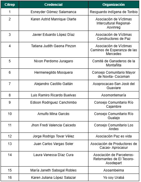 Laura Vanessa Díaz Cura, es la nueva representante de la CITREP No.15. Reconocida como líder desde el 2019 en el momento que se le hace devolución del predio familiar del cual su familia fue desplazada. Fundadora de la Asodepart, proyecto del cual alcanzó reconocimiento nacional al superar las secuelas de la violencia y colaborar con el desarrollo económico del territorio.